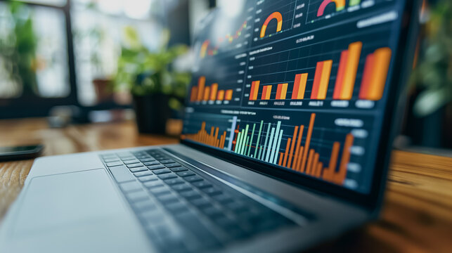 A laptop displaying a graph with a green line. The graph is showing a trend in the data
