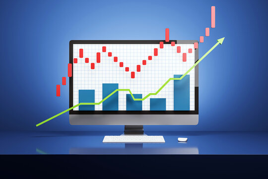 Computer screen showing a stock market chart with upward trend on a blue background. 3D Rendering