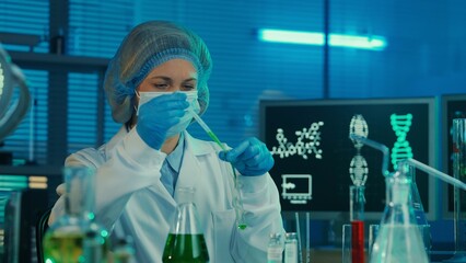 A female pipettes a green liquid into a glass test tube. A woman in a white medical gown, bonnet, blue gloves and a mask in a laboratory with test tubes, flasks and computer monitors. Close up.
