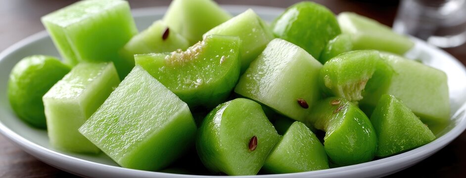 Fresh green melons and fruits arranged on a plate, ready to be served as a healthy snack or dessert at a summer gathering