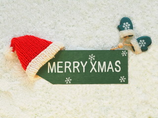 Green sign Merry Xmas with mittens and red hat of Santa Claus on snowy background
