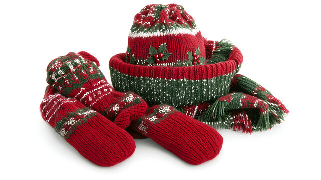Cozy Christmas-themed knitted set: red and green hat, scarf, and mittens. Perfect for winter holidays. Festive and warm.