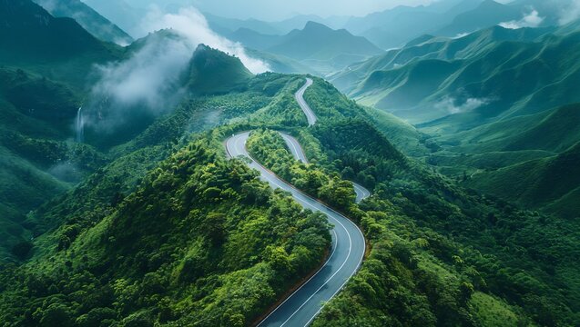 Winding road through lush green mountains