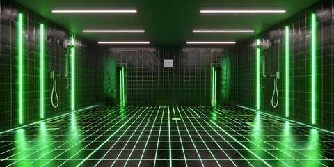 Neon Green Shower Room: A futuristic, minimalist shower room with vibrant green neon lights illuminating the sleek black tiled walls and floor.