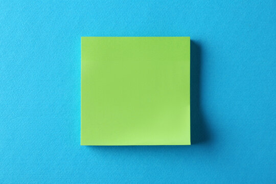 Blank green note on light blue background, top view. Space for text