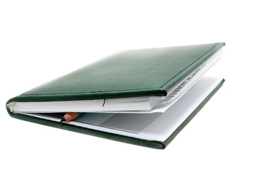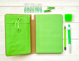 fresh green stationary. green notebook with eraser, pen,pencil and paper clips on white wooden background
