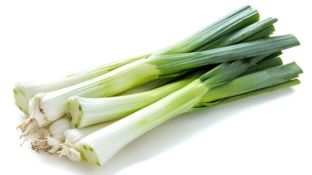 A close-up shot of a bunch of green onions on a white surface, perfect for food or still life photography