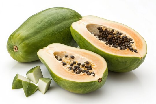 Fresh Green Papayas Cut Half White Flesh Seeds Yunnan Tropical Fruit Exhibition White Background
