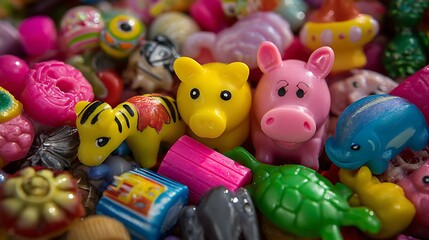 Colorful close-up showcasing an assortment of small, plastic toy figures in vibrant hues