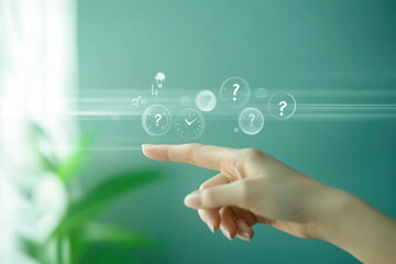 Digital inquiry concept with floating message icons and a prominent question mark on a bright screen