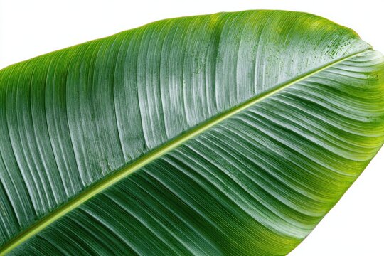 A vibrant green tropical leaf, elongated and ovate, exhibits prominent parallel veins radiating from a central midrib, showcasing a gradient of lighter green hues at the edges