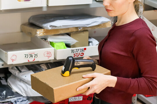 Female worker aiming scanner at box in warehouse shelves