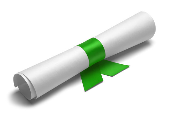 Rolled kraft paper scroll tied with twine and a tag, adorned with fresh green leaves. Isolated on a white backdrop, simple presentation
