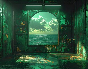 The interior is made of old green sheet metal with a hole through which you can see the sea.