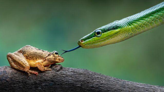 View of a tense moment between a green snake and a brown frog in their natural habitat, Riau Province, Batam, Indonesia.