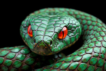 A serene green snake coils gracefully on a pristine white background, its eyes reflecting a world of mystery and intrigue