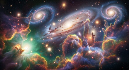 Multiverse Cosmic Storm with a Unique Green Spiral Galaxy and Colorful Nebulas.