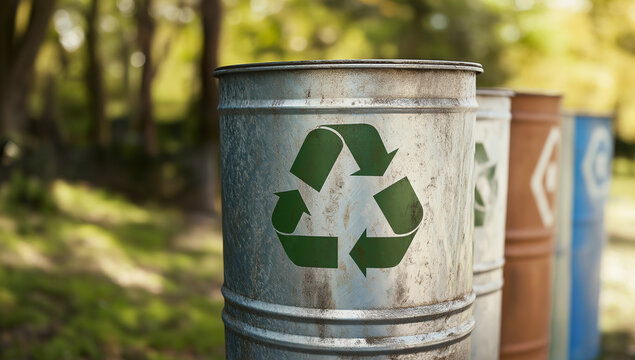 リサイクルマークの付いた金属のゴミ箱 / Metal recycling bin with green symbol