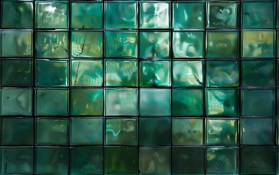 Green square tiles in a gradient from dark to light create a stunning textured background, perfect for modern interior design. The shiny surface adds a pop of color and symmetry to any space