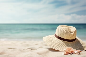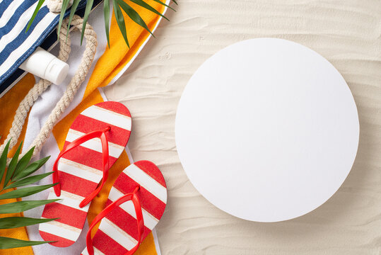 Beach Accessories on Sandy Summer Background. All You Need for a Perfect Day at the Beach: Towel, Hat, Sunglasses and More