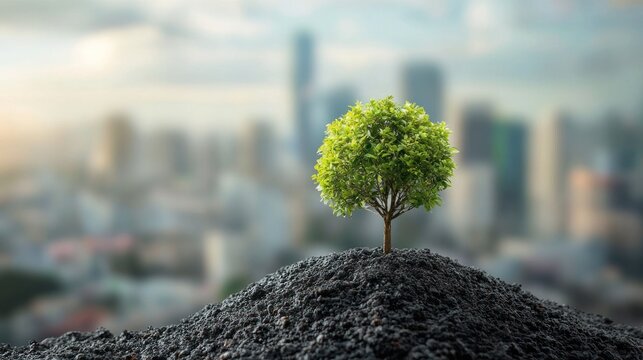 A green tree growing on a rocky hilltop with a city skyline in the background.