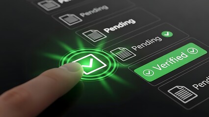 Finger pressing green verified button on digital interface screen with pending and verified status