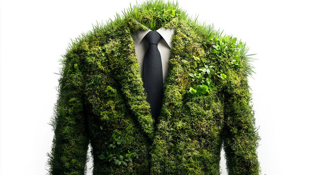 businessman's suit crafted from lush grass and moss symbolizes the fusion of nature and industry, sustainability, and eco-friendly business practices, blending modernity with green values