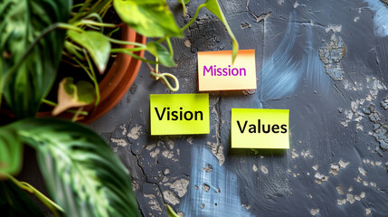 Mission vision values on sticky note with green plant,  Corporate goal strategy concept
