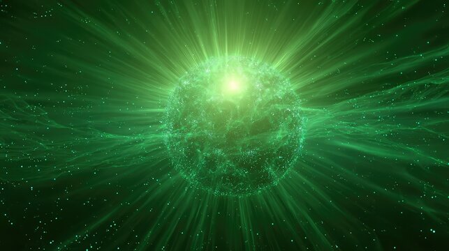 Green energy sphere radiating light in space