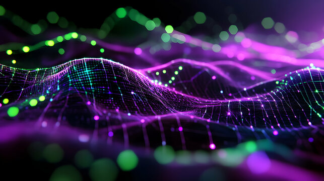 Abstract visualization of flowing neon light waves forming a dynamic, colorful digital landscape with glowing dots and lines on a dark background