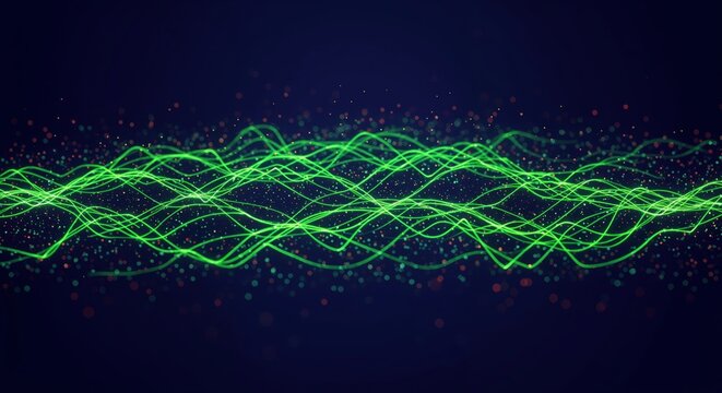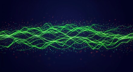 Abstract digital visualization of dynamic green waveforms and particles on a dark background representing futuristic technology and data flow