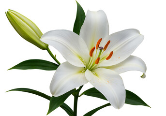 Single white lily flower with bud and green leaves
