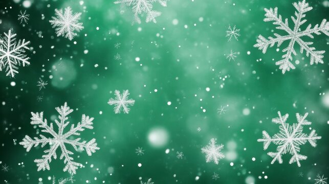 Winter wonderland with falling snowflakes on green background