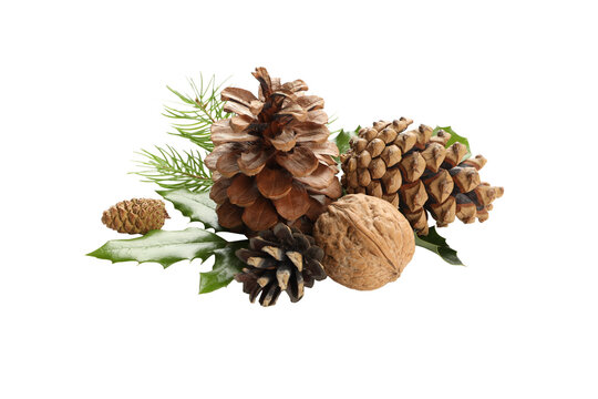 Christmas decorations with figurine, pinecones, and sleigh on greenery