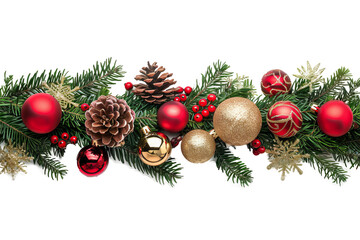 Christmas garland with red and gold ornaments, pine cones, and berries on transparent background