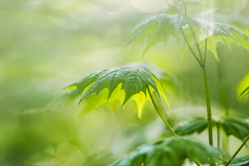 Plant with green leaves in rain