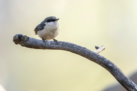 Wild pygmy nuthatch foraging for food in a park in Colorado.