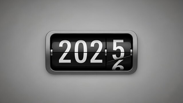 A sleek odometer-style year counter transitioning from 2025 to 2026, symbolizing progress, growth, and the New Year. Minimalist grey background, clean design, perfect for business, finance, and future