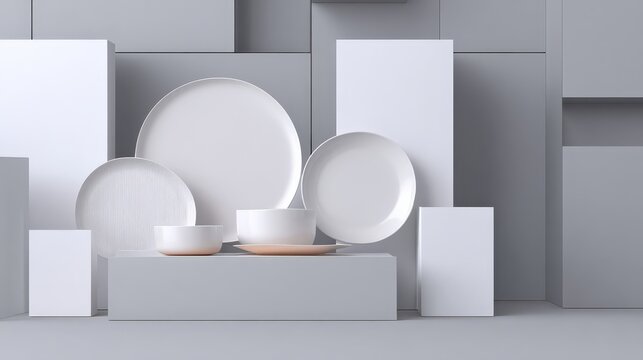 A minimalist arrangement of white ceramic dishes displayed against a backdrop of geometric, grey blocks, emphasizing simplicity and elegance.