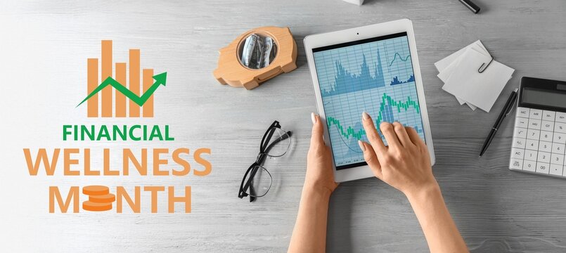 Banner for Financial Wellness Month with female hands holding tablet computer