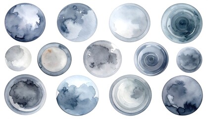 Watercolor circles in shades of grey and blue, varying in texture and opacity