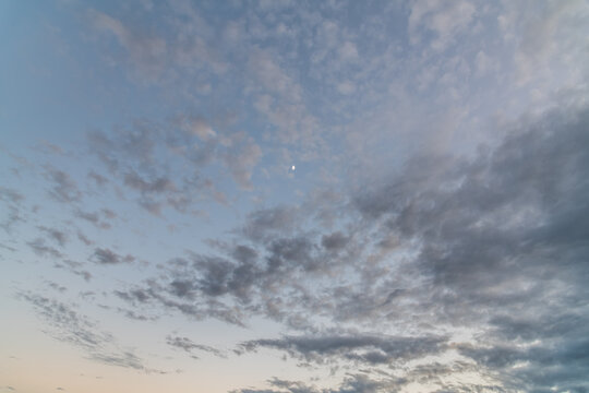 Before sunrise the sky, soft grey clouds and partial moon
