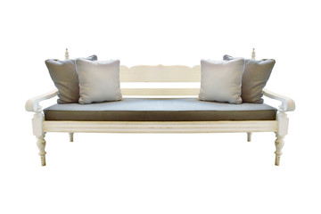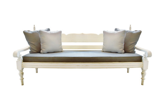 Vintage Style Long Bench with Cushion and Pillows Isolated on White Background