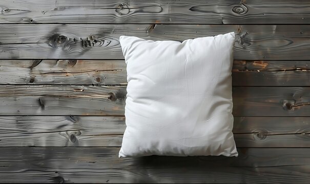 Featured is a flat lay mockup of a white square cushion on a grey wooden background