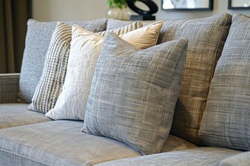 The  many cushion comfortable sofa in balcony modern apartment  as looking  green garden