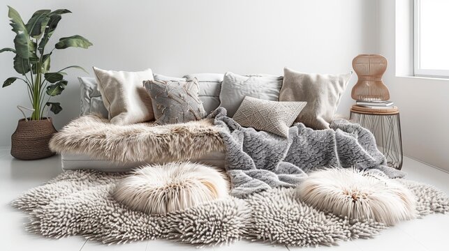 Light filled room with an off-white sofa, textured pillows, and green plants