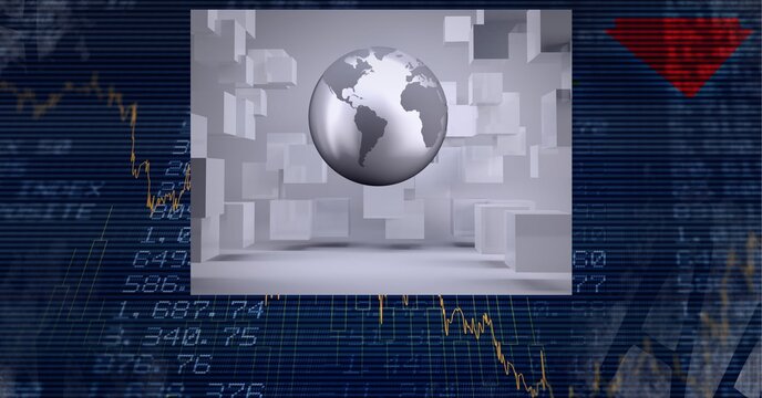 Composition of grey globe on screen aver financial data processing on blue background