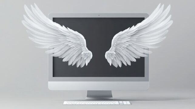 PC with Wings Isolated on Grey Gradient Background. Vector.