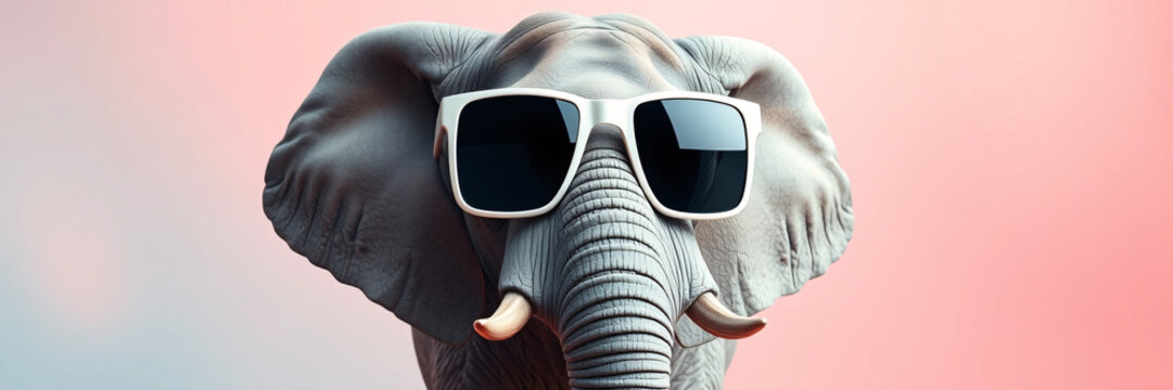 A close-up portrait of an elephant wearing large, stylish white sunglasses against a soft pink and grey gradient background. Banner. Travel concept