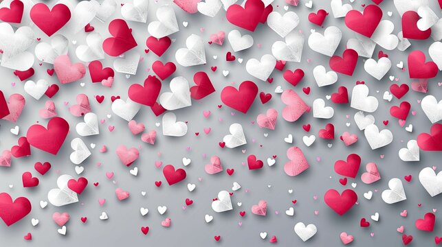 Scattered Hearts in Shades of Red, Pink, and White on Gray Background